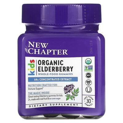 New Chapter's Organic Elderberry Whole-Food Gummies feature organic ingredients and specifically utilize ElderCraft European Elderberry extract, a form often associated with quality and consistency. Alongside the elderberry, it includes an organic fruit blend, offering a more 'whole-food' approach in a gummy format.