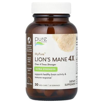Pure Essence MyPure Lion's Mane 4X is presented as a concentrated extract, suggesting a higher potency per dose for those focused on cognitive enhancement. It uses organic Lion's Mane mushroom extract and is packaged in Vegi-Caps, making it suitable for various dietary preferences.