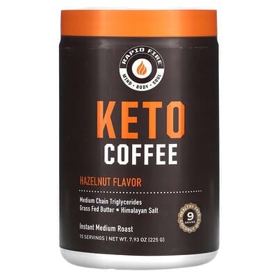 Rapid Fire Keto Coffee Caramel Macchiato Flavor is formulated to support ketogenic diets, providing 9 grams of fat per serving for energy and satiety. It functions as a convenient 'fat coffee' to help maintain ketosis, offering a flavored beverage option for those following a low-carb, high-fat lifestyle.
